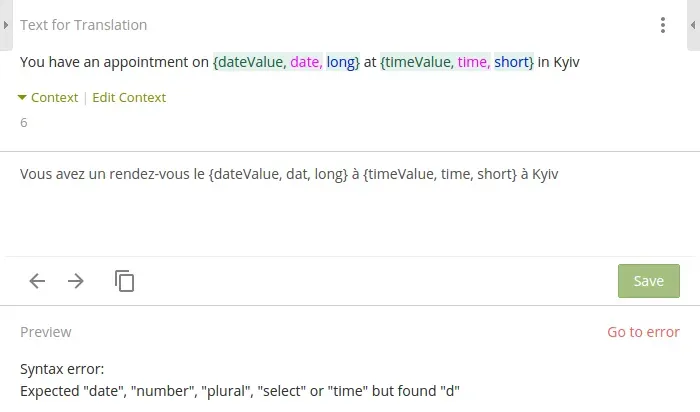 Crowdin recognizes ICU formats and with a help of really handy Pre-view option makes it possible to observe different variations. Syntax is also highlighted so it is very convenient to keep required areas within the sight and manage translations swiftly!