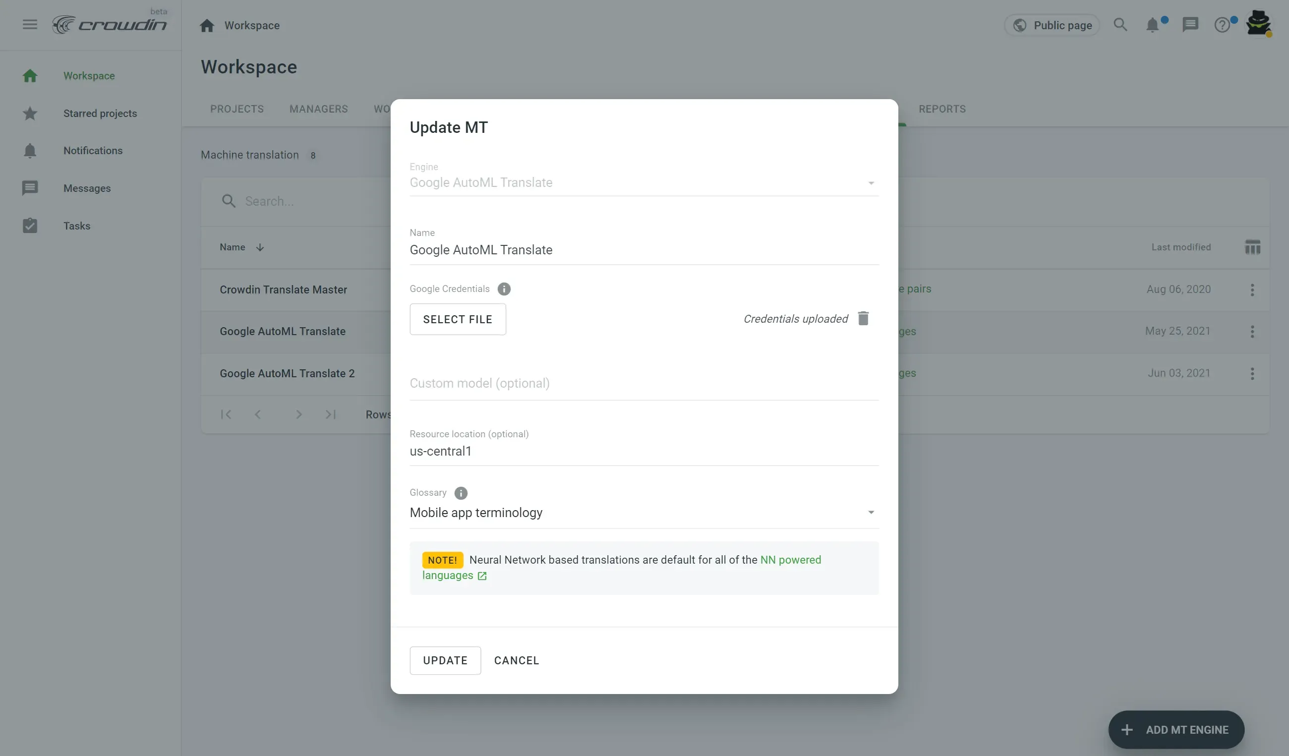 Connect a custom Glossary to Google AutoML in the Machine Translation settings, so it’s used when you’re translating with this engine. This way, your brand terminology would remain more consistent. The supported Glossary files include TSV, CSV, or TMX files.